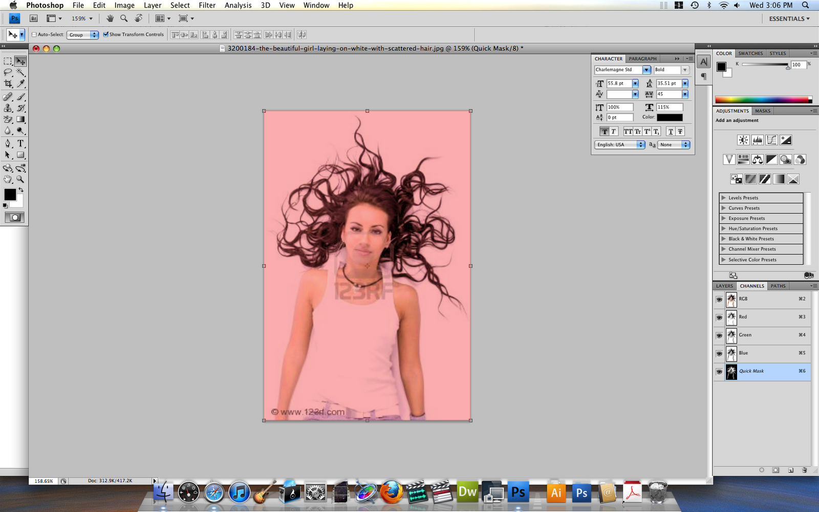 As you paint with the black over previously selected areas, the part you paint over will become a darker red. This color is what will not be selected when you toggle back out of quick mask mode. Notice the arm on the right below (her left arm). It is a darker red because I have gone over it with my brush.